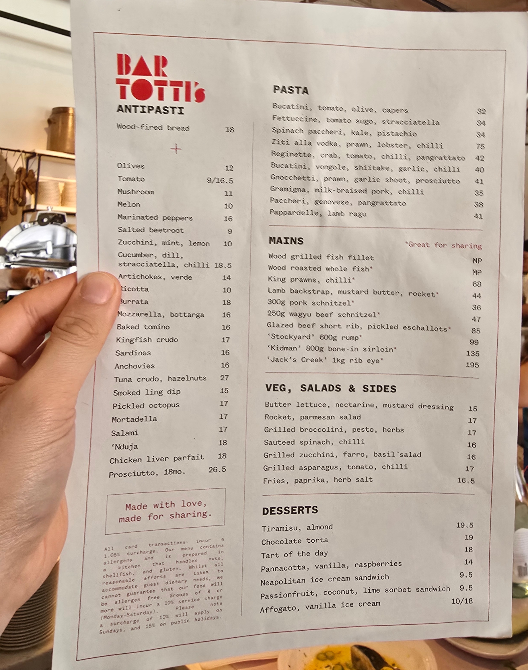 시드니 중심가 조지 스트리트에 위치한 Bar Totti’s(바 토티스) 는 호주 외식 그룹 Merivale이 운영하는 레스토랑으로, 언제나 대기가 있을 정도로 인기가 많아요. 특히 점심시간(12시 오픈 런)엔 현지인들과 여행객이 몰려듭니다.