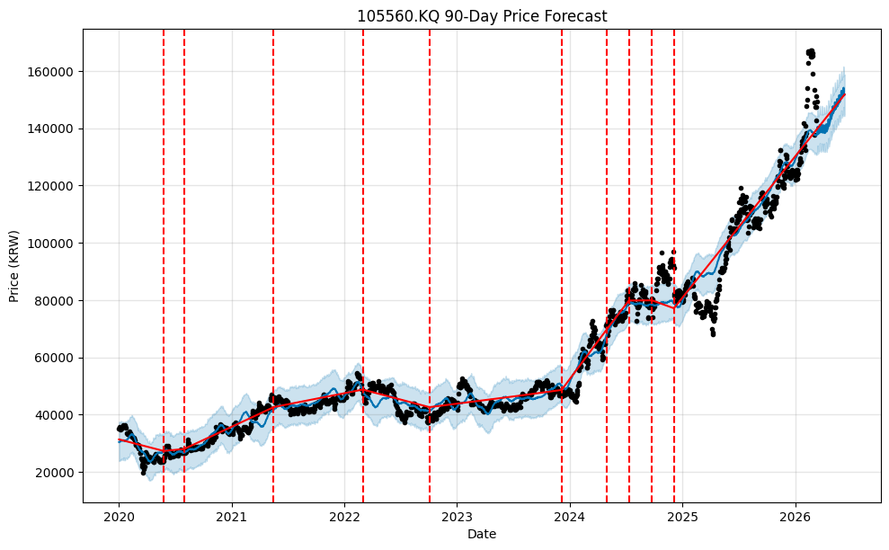 코리아 디스카운트 해소의 선봉장, KB금융(105560)의 기세가 무섭습니다. 2025년 역대 최대 실적 경신에 이어 올해 초 무려 1.2조 원 규모의 자사주 소각을 단행하며 진정한 밸류업이 무엇인지 보여주고 있는데요. 주당 순이익(EPS) 가치가 급격히 높아지는 가운데, 예측 오차율(MAPE) 12.59%의 정교한 데이터를 바탕으로 향후 90일간 KB금융의 주가 시나리오를 심층 분석해 보겠습니다. 1. 기업 개요 및 위치: 금융의 중심 여의도의 사령탑KB금융그룹은 은행, 증권, 보험, 카드 등을 아우르는 대한민국 최대 규모의 종합금융그룹입니다.본사 위치: 서울특별시 영등포구 국제금융로8길 26 (여의도동)금융의 메카 여의도 중심부에 위치하며, 최근 완공된 KB국민은행 통합사옥과 함께 그룹 시너지를 극대..